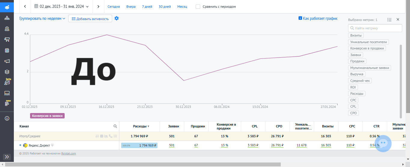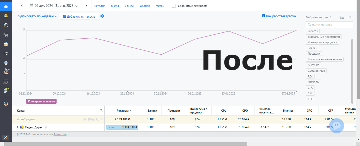 Ниже скриншот из Roistat в динамике на примере декабрь 2023-январь 2024 (прошлый специалист) и декабрь 2024 -январь 2025 (я).