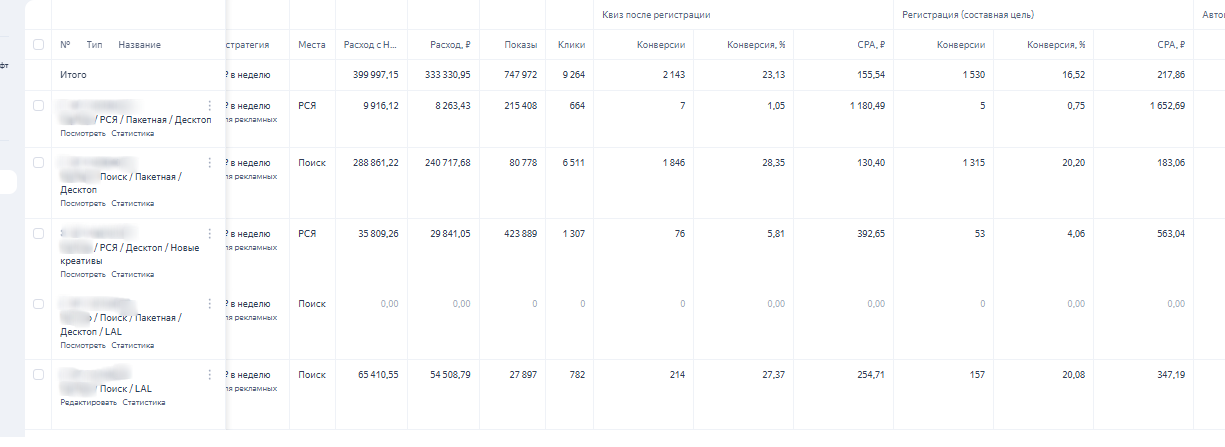 На основе данных сквозной аналитики о регистрациях и продажах внес корректировки в кампании: оставил в работе наиболее эффективные связки. Проводил еженедельные и ежемесячные плавные корректировки: чистка площадок, ключевых фраз, расширение семантики, тест новых аудиторий